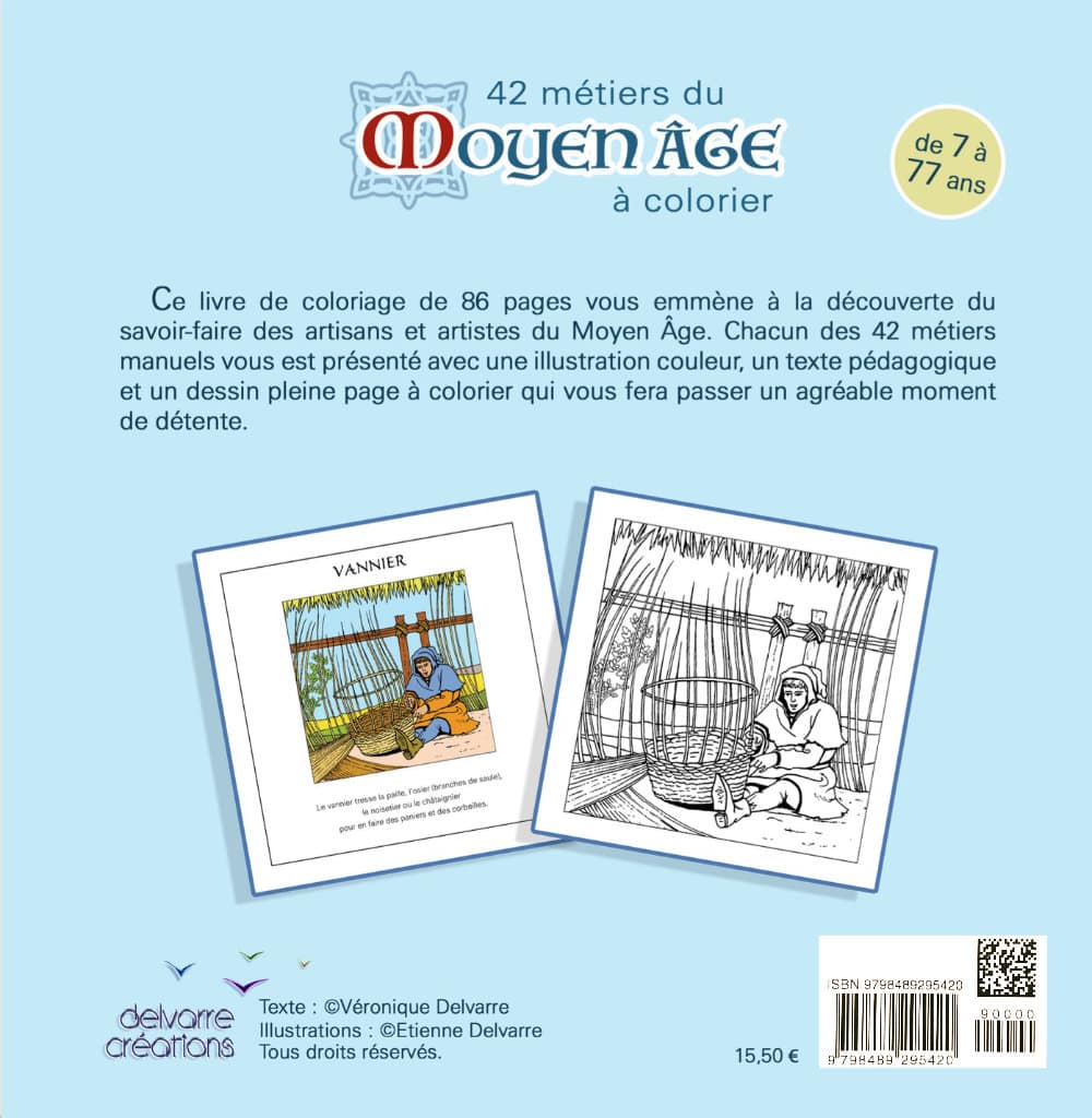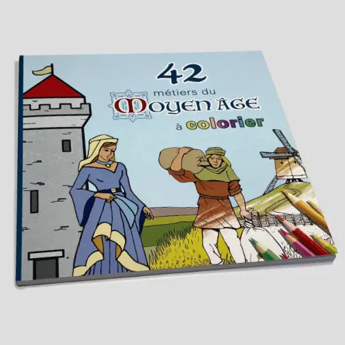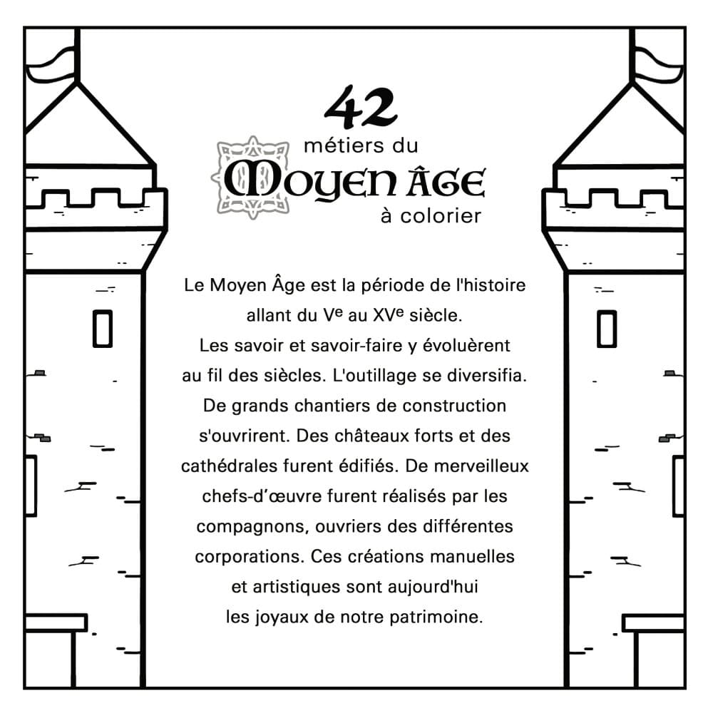 Ce livre de coloriage de 86 pages vous emmène à la découverte du savoir-faire des artisans et artistes du Moyen Âge. Chacun des 42 métiers manuels vous est présenté avec une illustration couleur, un texte pédagogique et un dessin pleine page à colorier qui vous fera passer un agréable moment de détente.